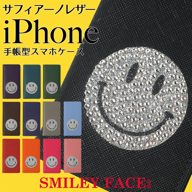タイプ : フリップ 手帳型 横開き 左開き 右開き カード収納 同系色のストラップ付き 素材 本体とストラップ : 牛革(本革にサフィアーノ模様をエンボス加工) スマイリーフェイスのデコレーション : スワロフスキー ケース : PC(ポリカーボネート)またはシリコン サフィアーノ(saffiano=網) : イタリア高級ブランド「P社」が開発した素材で、傷や汚れに強い特徴があり、財布や鞄など幅広く使用されています。